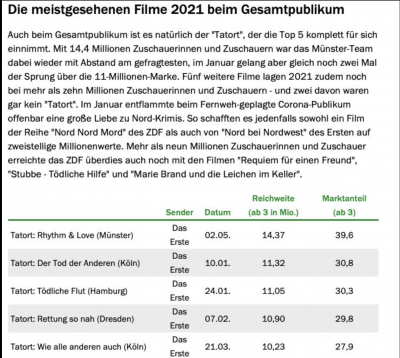 Man könnte jetzt fragen, ob die Quote einen Rückschluss auf die Qualität eines Films zulässt. Zudem könnte man fragen, ob Jahresrückblicke mehr sind als Lückenfüller - Winterloch analog zum Sommerloch - wenn sonst nicht viel los ist auf der Welt. (Außer Corona, ja, gut.) Aber vielleicht sagt man auch einfach: Tatort „Der Tod der Anderen“ (Fischer, Kruse, Bolten & Stauch) liegt in der Jahresendabrechnung aller TV-Filme 21 (über 11 Mios, über 30 % Marktanteil) auf Platz 2: Leider geil.